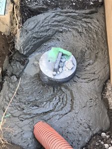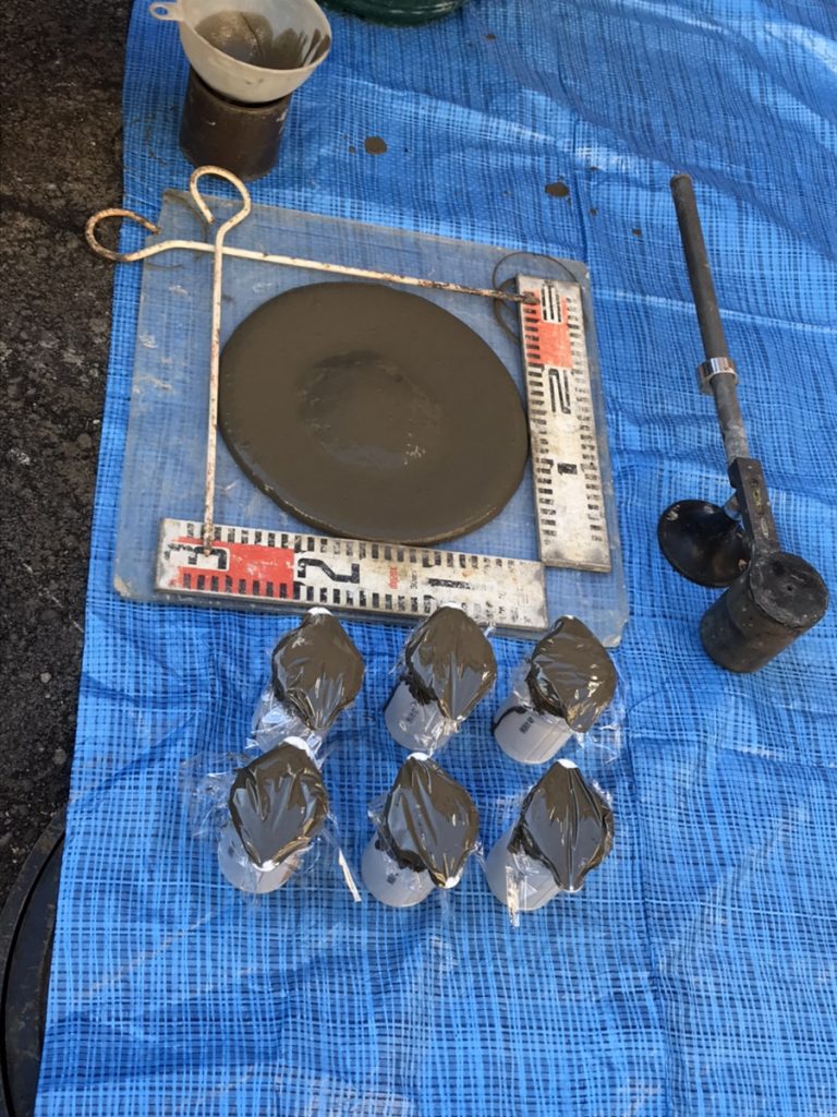 この工事は、穴のサイズや形がわからない場合や構造物等があって土の締固めができない場合に行われる工事で、泥に固化材を混ぜたどろどろの処理土を穴に流し込むと半月~1か月後に固まる、というもの。材料費は高額になりますが、締固めなしに地盤の支持力を得ることが出来る優れた工法です。