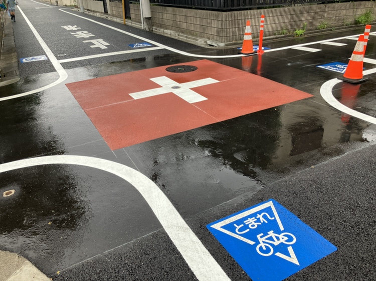 対して透水性舗装は、雨水が浸み込むため大雨の時でもスリップや道路冠水がしにくく、また周辺の下水管に流れ込む雨水が減らせるため、ゲリラ豪雨時でも下水があふれる可能性が低くなります。(どのくらい違うかは下の写真をご覧ください)